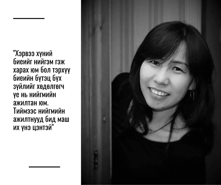 -Миний үндсэн мэргэжил бол хувцасны загвар зохион бүтээгч. Энэ мэргэжлээр ажиллаж байх явцдаа үйлчлүүлэгч төвтэй үйлчилгээ гэдэг зүйлд их суралцаж үйлчлүүлэгчээ сонсох, харилцах замаар аажмаар нийгмийн ажил руу орсон. Анх гэр бүл зохиогоод хоёр хүүхдээ харж байх үедээ ахмадуудад сайн дураараа зүймэл даавуу урлалын хичээл заадаг байв. Тэгээд л нийгмийн ажил мэргэжилд суралцсан. Би хүүхдэд маш их хайртай. Багшлах нь их сайхан мэргэжил. Нийгмийн ажлын салбарт үндсэндээ бол 21 жил ажиллаж байна. Тэр дундаа яг нарийн мэргэжлээр буюу хүүхэд хамгааллын чиглэлээр 18 дахь жилдээ ажиллаж байна.