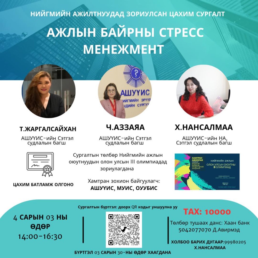 Нийгмийн ажилтнуудад зориулсан “Ажлын байрны стресс менежмент”-ийн талаар цахим сургалт удахгүй зохиогдох гэж байна. Бүртгэл 3сарын30-ны өдөр хаагдах тул амжиж бүртгүүлээрэй???? Доорх QR кодыг уншуулан идэвхитэй оролцоорой.