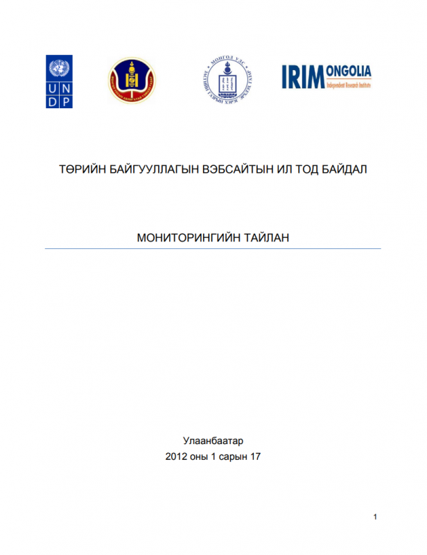 Төрийн байгууллагын цахим хуудасны ил тод байдлын мониторингийг 2011, 2014, 2015, 2016, 2017, 2018 онуудад тус тус хийж гүйцэтгээд байна. Үр дүнгээс харвал, төрийн байгууллагын цахим хуудаснууд тогтсон стандартгүй, мэдээллээ тогтмол шинэчлэдэггүй, иргэдэд хүрэх ёстой мэдээллийг цахим хуудастаа байршуулдаггүй зэрэг нийтлэг дутагдлууд байна. Тиймээс, жил болгон давталттай хийж буй энэхүү мониторингийн тайлан нь төрийн байгууллага бүрээр цахим хуудасны үр ашигтай байдал хэрхэн сайжирч эсвэл муудаж буйг бүртгэн гаргаж, эрэмбэ үүсгэн, тогтмол сайжуулах хөшүүрэг болж байгаагаараа үнэ цэнэтэй ажил болж буй юм.